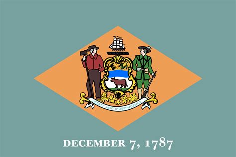 The Delaware flag has a simple yet powerful design. It consists of a colonial blue background with a buff-colored diamond in the center. Inside the diamond, there are the state coat of arms and the words "December 7, 1787," which signifies the date Delaware ratified the United States Constitution and became the first state to join the Union.